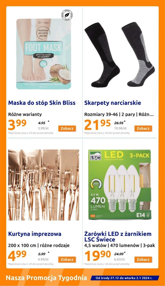Produkty w gazetce: skarpetki,maska do stóp,kurtyna,żarówki